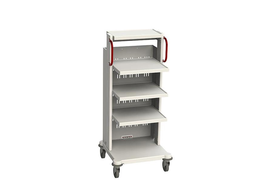 Изготовлена из конструкционной стали и специальных алюминиевых профилей, окрашенных полимерными красками. Наружные поверхности полок и основания выполнены из текстурированного листового ABS-пластика. Стойка для аппаратуры оснащена колесами Ø125 мм с повортным механизмом, два из которых с тормозами. Для удобного перемещения предусмотрены две боковые ручки красного цвета.