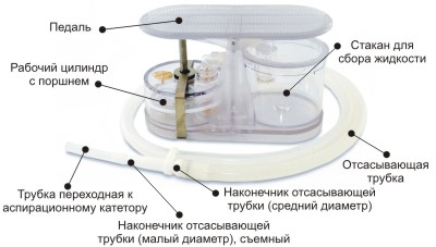 Аспиратор медицинский (отсасыватель) с механическим приводом, обеспечивает высокую эффективность аспирации (на густом аспирате до 2 л/мин) при минимальных усилиях и портативных размерах. Двухтактный принцип работы поршня позволяет создавать разряжение как на прямом, так и на обратном ходу поршня, при этом вдвое увеличивается эффективность и производительность аспирации. Благодаря оригинальным конструкторско-технологическим решениям усилие нажатия на педаль требуется небольшое, что позволяет производить нажатие как ногой (в том числе в положении сидя), так и рукой. В аспираторе медицинском имеется защита от переполнения сборника жидкости.