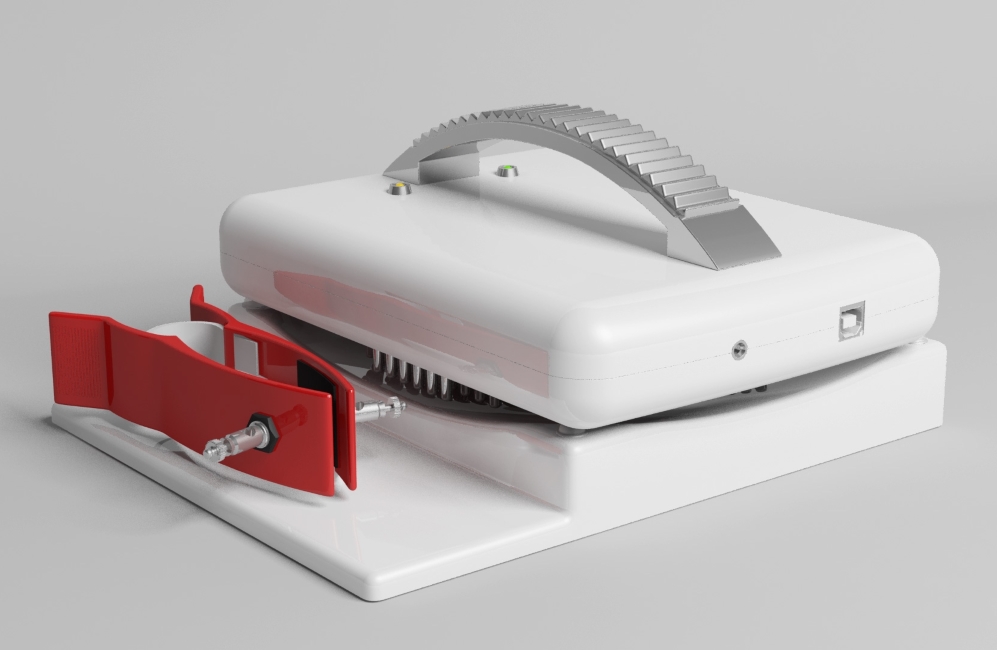 - К измерительному блоку с помощью кабеля подключаются два отводящих электрода, которые в процессе проведения обследования размещаются на руке пациента.