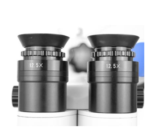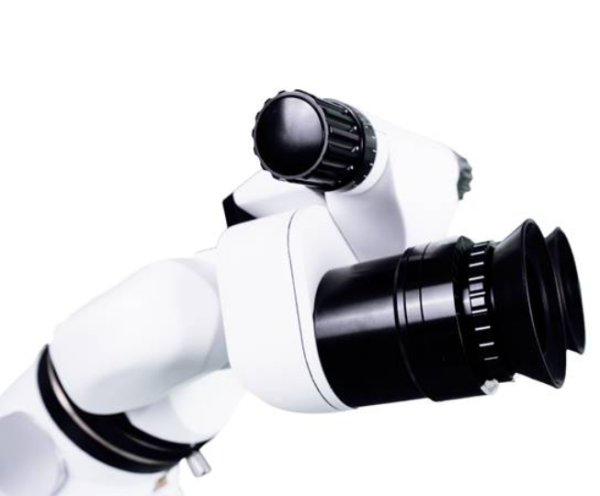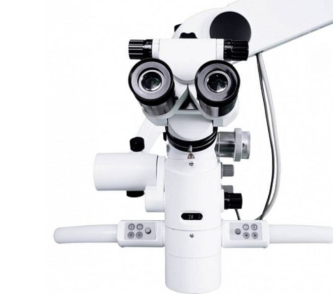 Расстояние между зрачками от 55 до 75 мм, стоматолог может удобно регулировать под свой размер глаз, ручки регулировки расстояния с обеих сторон головы микроскопа.