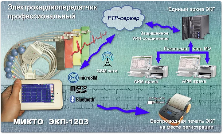 • встроенным GSM-модемом для автоматической цифровой передачи ЭКГ на удаленную Кардтоцентраль через FTP-сервер по существующим сетям сотовой связи.