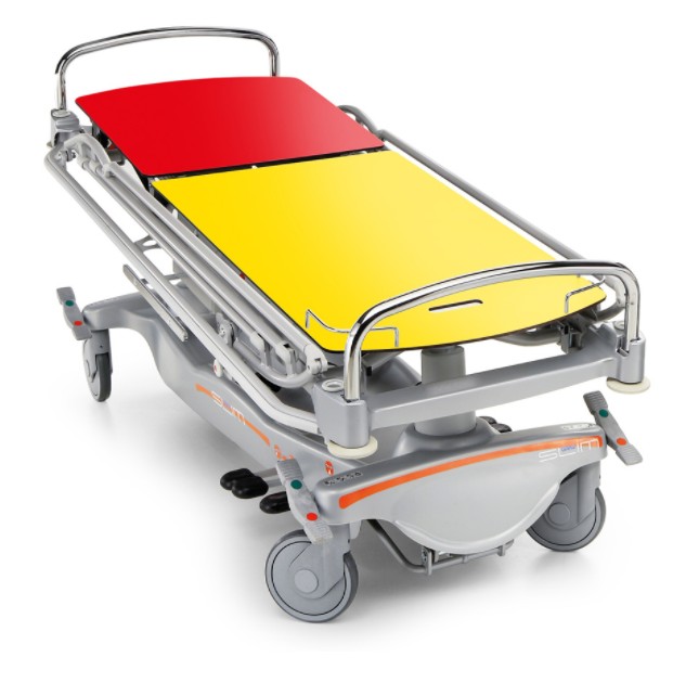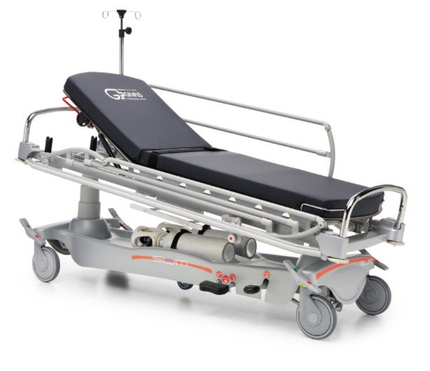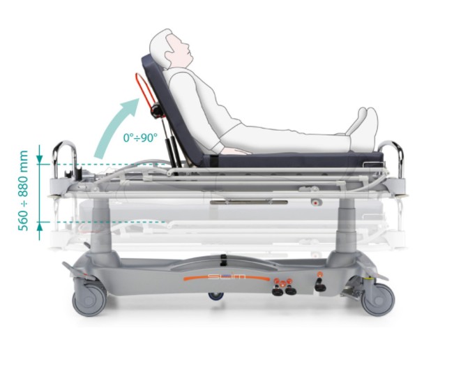 Изменение высоты ложа с 56 см (минимальная высота) до 88 см (максимальная высота) осуществляется благодаря гидравлической системе с двумя независимыми герметичными колоннами. Подъем ложа производится путем нажатия на одну их двух педалей, расположенных с обеих сторон каталки.Опускание ложа и приведение его в положения Тренделенбурга и антитренделенбурга выполняется сдвоенными педалями, также расположенными и обеих сторон каталки.