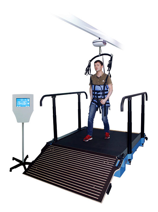 Широкое беговое полотно позволяет инструктору находиться на дорожке совместно с пациентом, помогая ему преодолеть страх самостоятельной ходьбы и гарантируя безопасность.