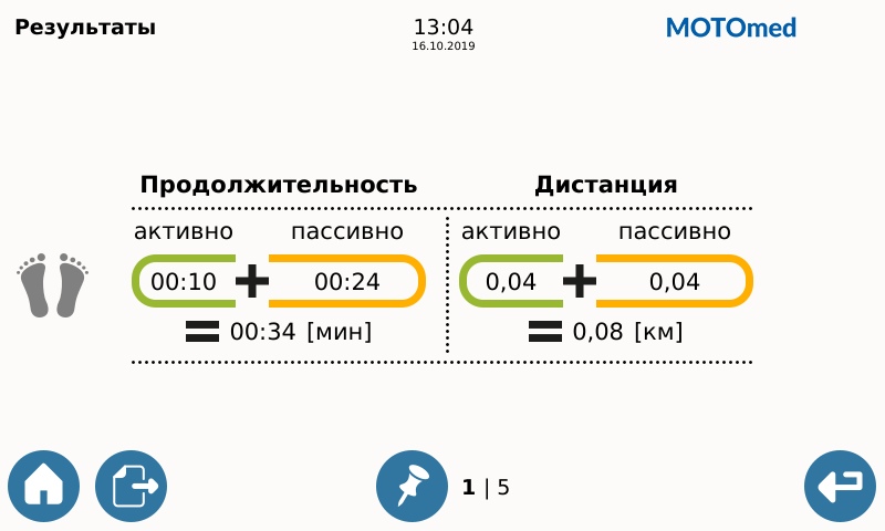 - По окончании тренировки на дисплей выводятся результаты, достигнутые пациентом за время тренировки: продолжительность тренировочного сеанса, пройденная дистанция, симметрия, затраченная энергия, тонус, среднее и максимальное значение мощности в кВт в активном режиме. Соотношение продолжительности тренировок в активном и пассивном режимах могут отображаться на экране в режиме реального времени, или же в составе общего анализа после тренировки.