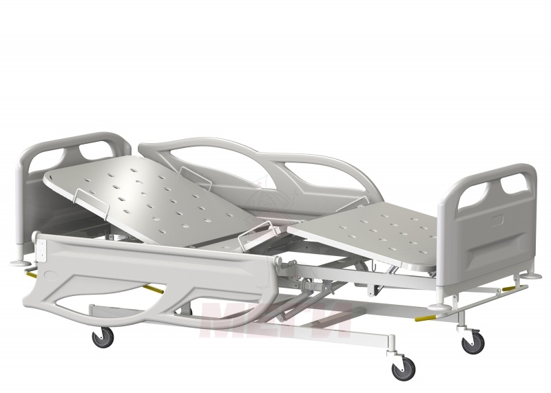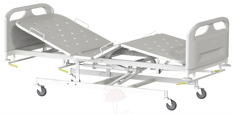 Многосекционное ложе кровати изготовлено из стальных труб и перфорированных металлических панелей из листовой стали толщиной 0,8 мм, что обеспечивает комфортное положение пациента на кровати и свободную вентиляцию подматрасного пространства.