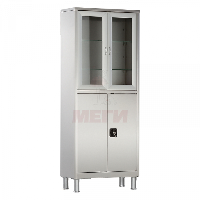 Шкаф медицинский из нерж. стали двухсекционный двухстворчатый, верх- стекло с окантовкой из алюминиевого профиля, низ – металл, (ригельный замок, ножки150 мм) предназначен для размещения и хранения лекарственных средств, перевязочных материалов, инструментов, медицинских расходных материалов и других изделий медицинского назначения.