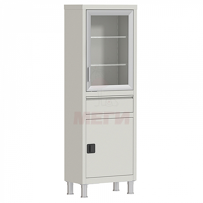 Шкаф медицинский металл. двухсекционный одностворчатый верх — стекло с окантовкой из алюминиевого профиля, выдвижной ящик, низ – металл (ригельный замок, ножки 150 мм). Предназначен для размещения и хранения лекарственных средств, перевязочных материалов, инструментов, медицинских расходных материалов и других изделий медицинского назначения
