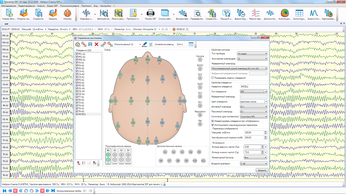 При регистрации используйте монополярные, биполярные и смешанные монтажи в схемах «10–20» и «10–10». Изменяйте монтаж в любой момент: перед регистрацией, в ходе регистрации, в процессе просмотра и анализа ЭЭГ после записи.