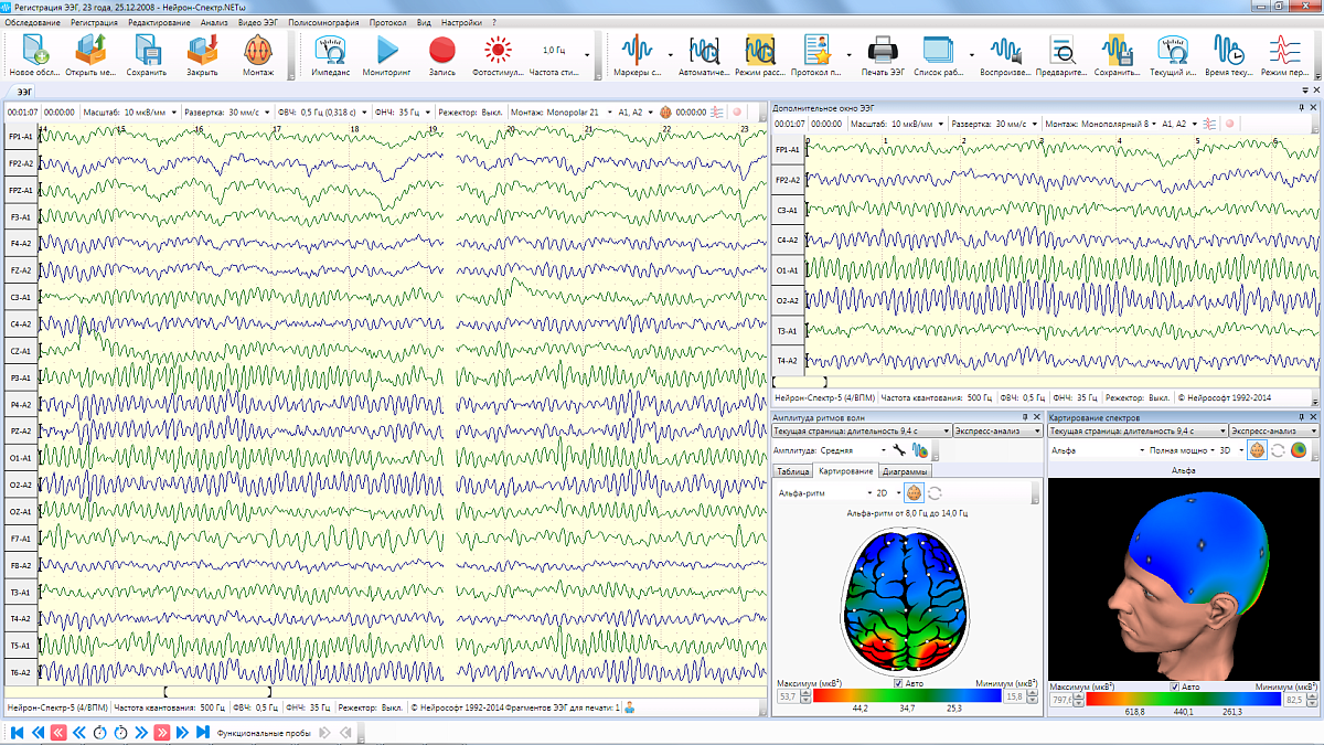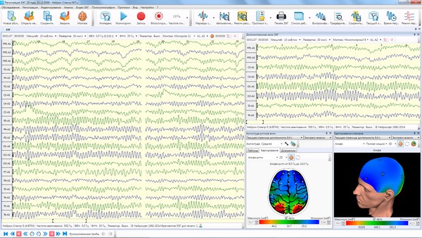 С «Нейрон-Спектр-2» вы можете начать анализировать записанную ЭЭГ уже во время регистрации. В режиме разделения экрана в одной половине отображаются уже записанные кривые, в другой — идет регистрация новых ЭЭГ-сигналов. С помощью автодетекции спайки и острые волны будут отмечены на кривых маркерами. Все это повышает скорость работы и увеличивает поток пациентов, которых вы можете принять.