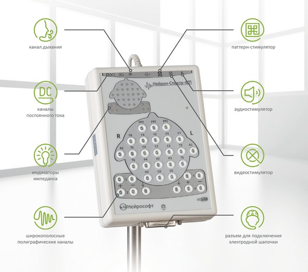 К электроэнцефалографам серии «Нейрон-Спектр» можно подключить следующие модули: модуль для полисомнографических исследований, недорогой и профессиональный модуль видеонаблюдения, модуль пространственной локализации источников патологической активности, модуль для исследования вызванных потенциалов мозга, модуль для реоэнцефалографических исследований, модуль для исследования вариабельности ритма сердца, внешний модуль регистрации SpO2, CO2.