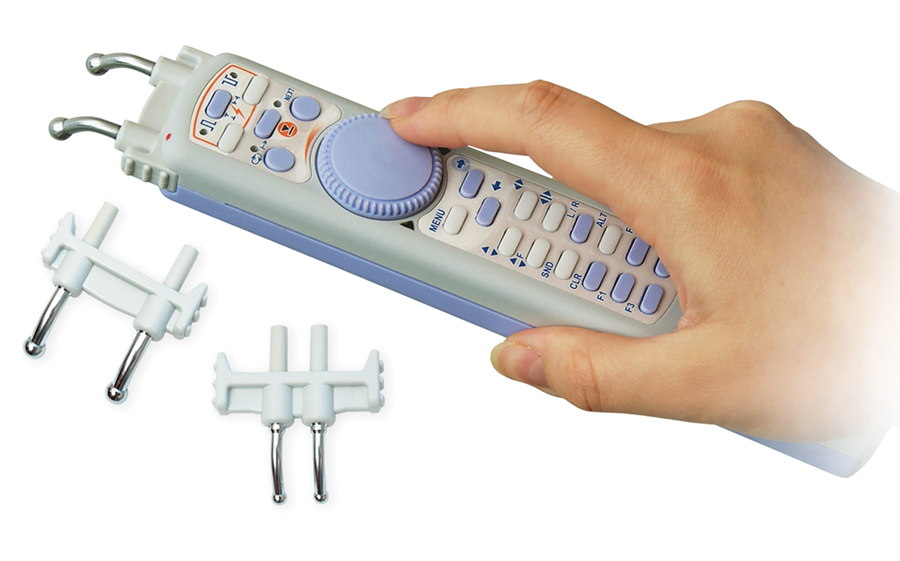 - Оригинальный пульт дистанционного управления (ПДУ) – эквивалент функциональной клавиатуры нейромиографа – упрощает проведение многократных стандартных исследований, избавляя врача от необходимости постоянно обращаться к клавиатуре и мыши компьютера. Управление нейромиографом с помощью ПДУ аналогично пользованию пультом управления телевизора.