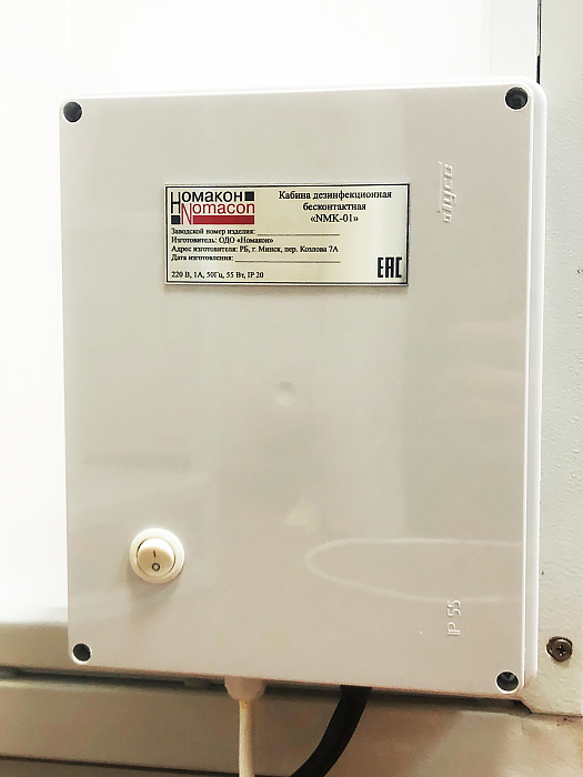 - Конструктивно дезинфектор состоит из металлического окрашенного корпуса с устойчивой рамой в основании. Внутри корпуса с обеих сторон установлены форсунки для распыления дезинфицирующего средства. Датчик обнаружения объекта в зоне распыления установлен на правой боковой стене дезинфектора.