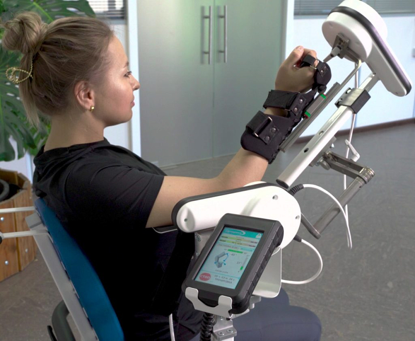 «Орторент-локоть компакт» – реабилитационный тренажер для роботизированной механотерапии верхних конечностей, используемый для непрерывных пассивных движения (НПД) локтевого сустава.