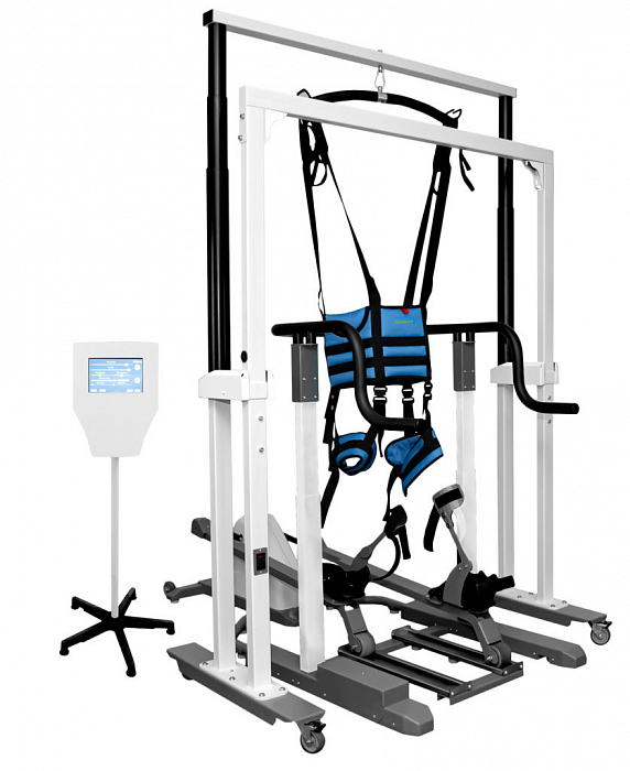 Подвес реабилитационный для вертикализации пациента Орторент. Модель “Орторент С++” (стационарный с кинематической системой имитации шага) – это эффективное оборудование для роботизированной механотерапии нижних конечностей, которое успешно применяется для восстановления после травм, реабилитации после инсультов, при заболевании суставов конечностей и заболеваниях, сопровождающихся мышечной слабостью и расстройством координации движения.
