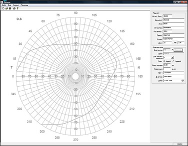 - формирует наглядный результат диагностики на диаграмной сетке в виде непрерывной линии, огибающей область зрения с выделением областей скотом, если таковые были определены;