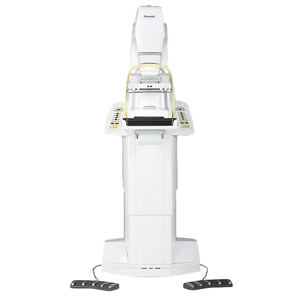 Цифровой детектор с большим полем обзора 24×30 см подходит для просмотра молочных желез любого размера, а изоцентрический поворотный кронштейн обеспечивает легкое равномерное перемещение маммографа. Данный плоскопанельный детектор с аморфным селеном (a-Se) и размером пикселя 85 mkm позволяют получать изображения высочайшего качества при минимальной лучевой нагрузке