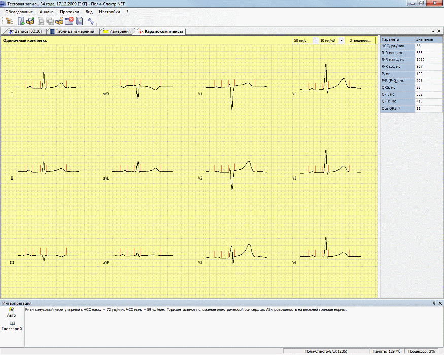 С помощью «Поли-Спектр-8/ЕХ» можно проводить весь спектр исследований электрической активности сердца — от рутинной ЭКГ до нагрузочного тестирования и оценки вегетативной нервной системы методом ВРС, а также контролировать процесс кардиореабилитации. Кроме стандартных 12 ЭКГ-отведений прибор имеет канал для регистрации частоты и ритма дыхания. По желанию кардиограф можно снабдить дополнительными модулями для комплексной оценки сердца.