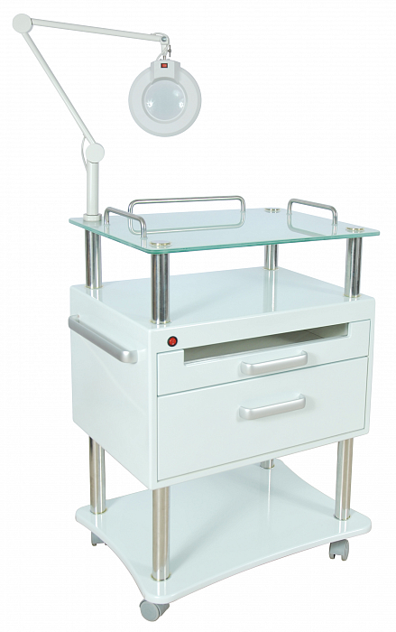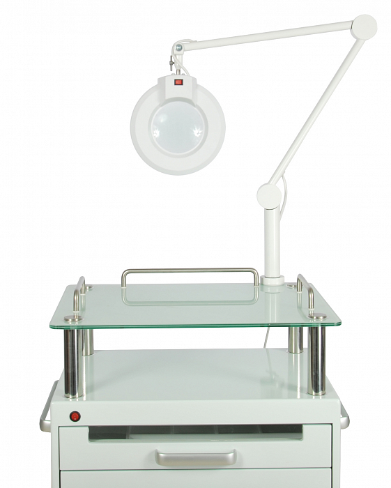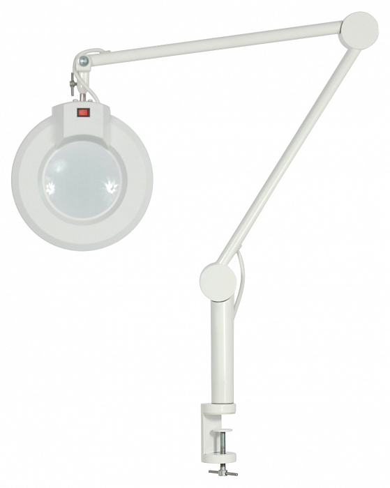 Лампа установлена на специальный кронштейн, с помощью которого можно крепить ее на рабочий стол. Корпус лампы выполнен из прочного металлического сплава, который не деформируется, не портится от попадания влаги, не подвержен коррозии. Установлена линза диаметром 120 мм. Она обеспечивает увеличение в 3 диоптрии. Собственный вес лампы составляет всего 4 килограмма.