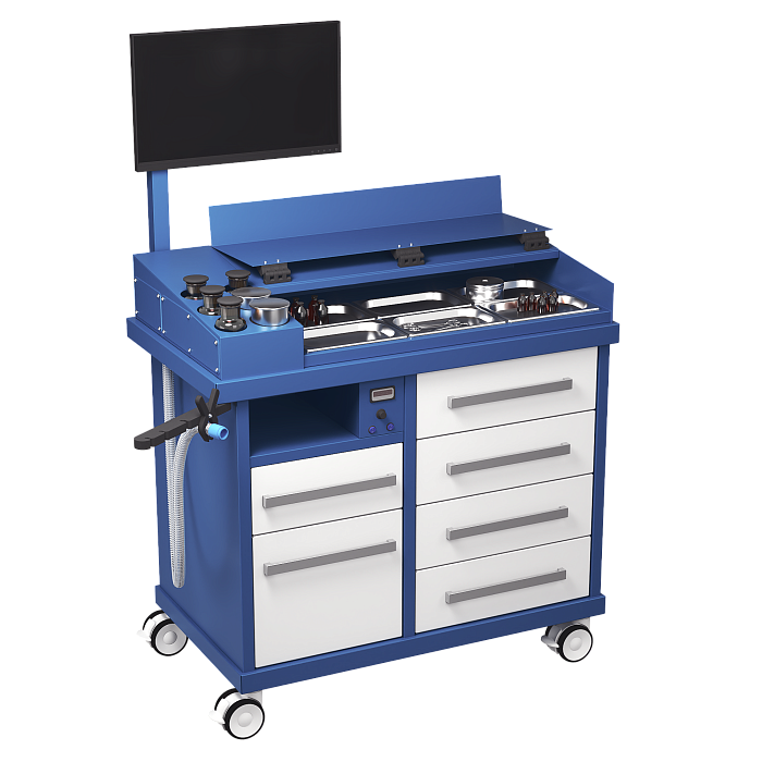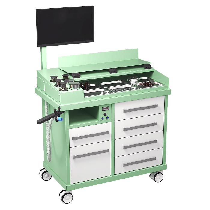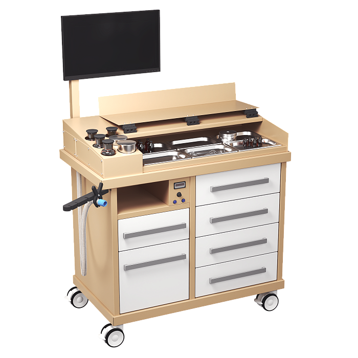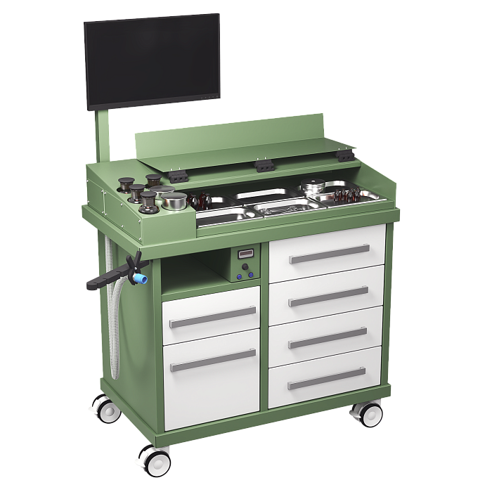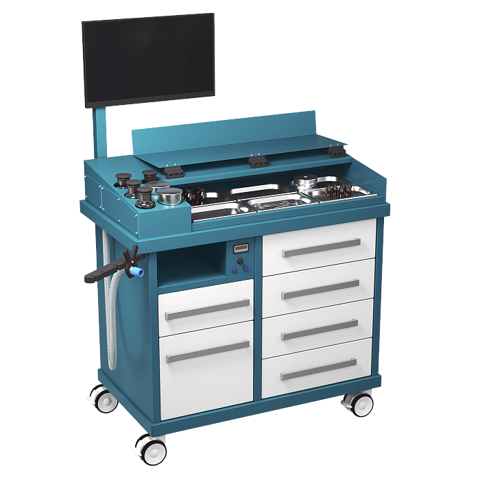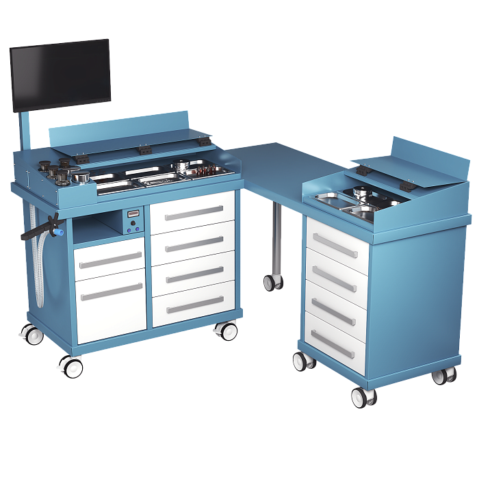 - Верхняя консоль с крышкой: Металлическая консоль с верхней крышкой и наполненным каскадом съёмных лотков, расположена на столешнице модуля тумбы