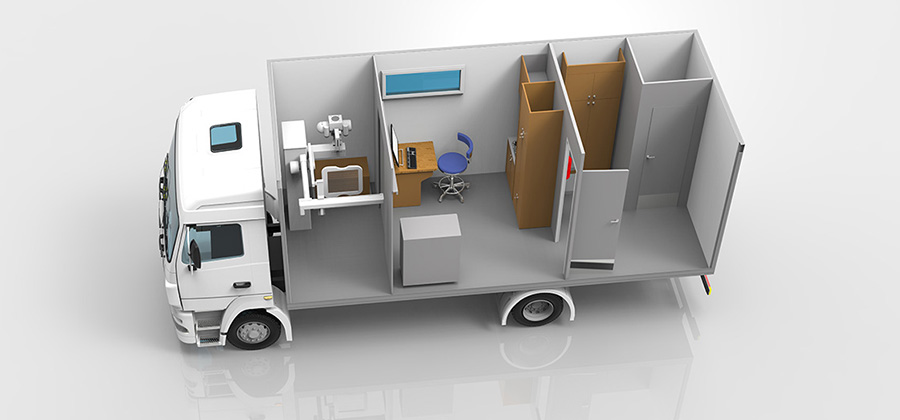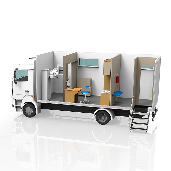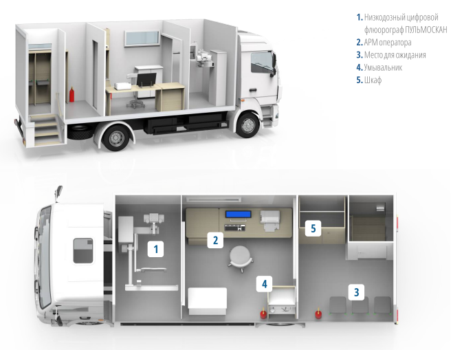 Комплекс является флюорографическим рентгеновским кабинетом, в котором расположен низкодозный флюорограф ПУЛЬМОСКАН. Мобильная цифровая рентгеновская флюорографическая система, предназначена для получения цифровых рентгенографических изображений органов грудной клетки для целей скрининговой и диагностической пульмонологии, то есть, для ранней диагностики туберкулеза, онкологических и других заболеваний органов грудной клетки.