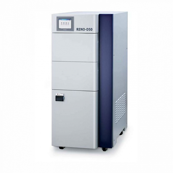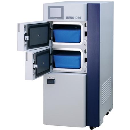 Экономичный аппарат для стерилизации RENO-D50 медицинских изделий и инструментов. В качестве стерилизующего вещества используется жидкий реагент пероксида водорода (H2O2), преобразуемый в плазму под действием электрического тока.