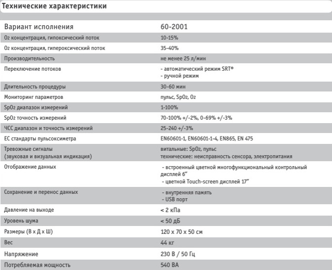 Безопасная и эффективная гипоксия развивается в организме человека при вдыхании газовой гипоксической смеси с 10‑15% содержанием кислорода кратковременными интервалами в повторяющемся режиме. Подача гипоксической смеси чередуется с подачей гипероксической смеси. Газовые смеси подаются через лицевую маску, подсоединенную к аппарату. Переключение между гипоксической и гипероксической газовой смесью происходит в автоматизированном режиме с применением встроенного высокотехнологичного диагностического модуля.