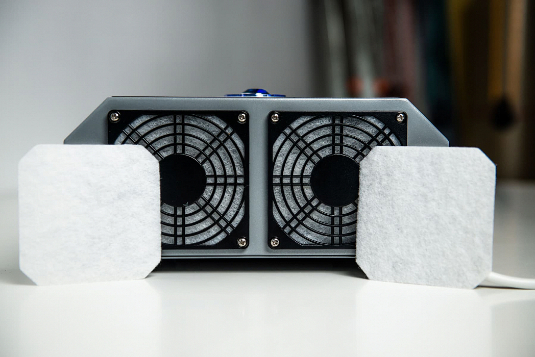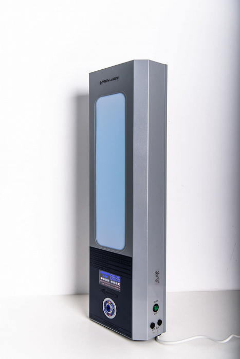 - Обеззараживание воздуха происходит в ходе принудительной циркуляции воздушного потока через металлический корпус, где на поток воздействуют три УФ-бактерицидные лампы мощностью 15 Вт каждая.