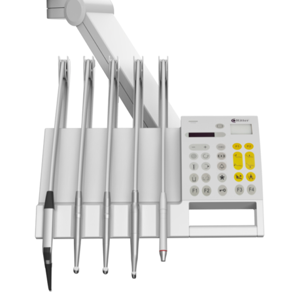 Тип подачи инструментов установки — нижний. Это классическая подача, которая популярна у стоматологов, так как доступ к инструментам очень прост. За ними не нужно тянуться и бороться с натяжением возвратной пружины. Модуль врача оснащен 6 инструментами, а также удобной и многофункциональной панелью управления креслом, в следствие чего под вашим контролем будет все системы установки Ritter Superior