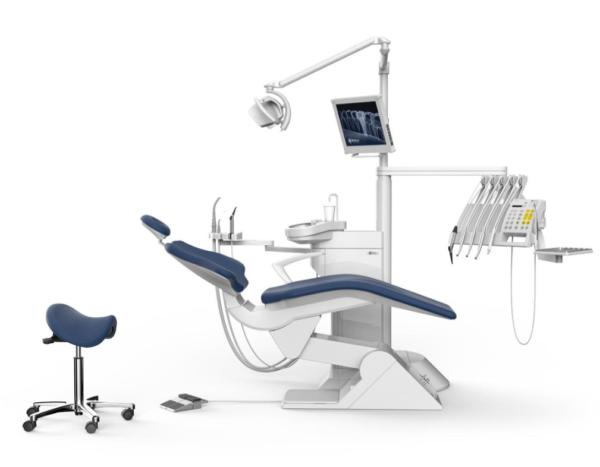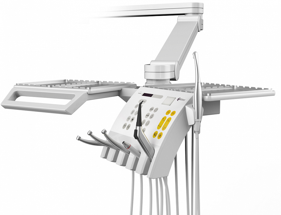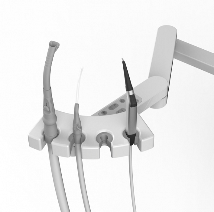 Для комфортной и полноценной работы ассистента установка оснащена эргономичным блоком, рассчитанным на 4 инструмента, в том числе слюноотсос, трехфункциональный шприц и дополнительная панель управления, позволяющая управлять положением кресла, плевательницей и другими системами установки.