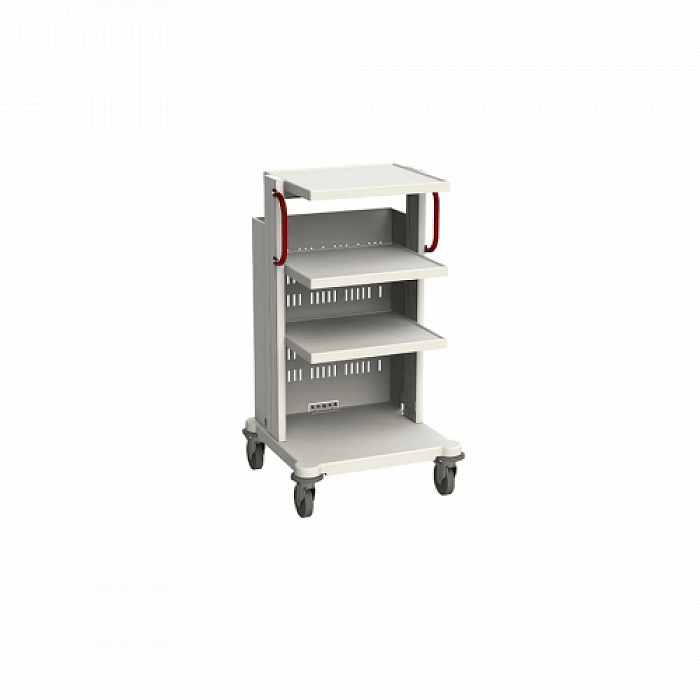 Изготовлена из конструкционной стали и специальных алюминиевых профилей, окрашенных полимерными красками. Наружные поверхности полок и основания выполнены из текстурированного листового ABS-пластика. Стойка для аппаратуры оснащена колесами Ø125 мм с повортным механизмом, два из которых с тормозами. Для удобного перемещения предусмотрены две боковые ручки красного цвета.
