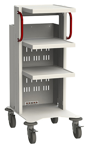 Изготовлена из конструкционной стали и специальных алюминиевых профилей, окрашенных полимерными красками. Наружные поверхности полок и основания выполнены из текстурированного листового ABS-пластика. Стойка для аппаратуры оснащена колесами Ø125 мм с повортным механизмом, два из которых с тормозами. Для удобного перемещения предусмотрены две боковые ручки красного цвета.