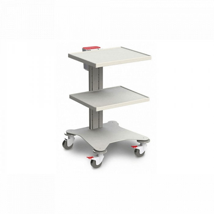 Изготовлена из конструкционной стали и специальных алюминиевых профилей, окрашенных полимерными красками. Наружные поверхности полок и основания выполнены из текстурированного листового ABS-пластика. Стойка для аппаратуры оснащена колесами Ø100 мм с повортным механизмом, два из которых с тормозами.