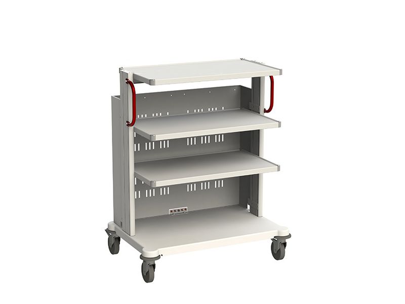 Изготовлена из конструкционной стали и специальных алюминиевых профилей, окрашенных полимерными красками. Наружные поверхности полок и основания выполнены из текстурированного листового ABS-пластика. Стойка для аппаратуры оснащена колесами Ø125 мм с повортным механизмом, два из которых с тормозами. Для удобного перемещения предусмотрены две боковые ручки красного цвета.