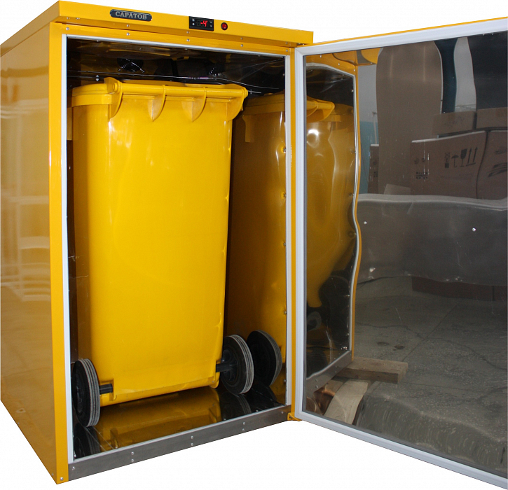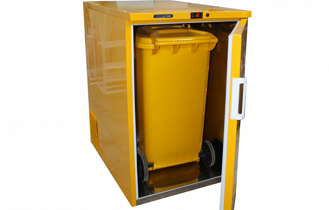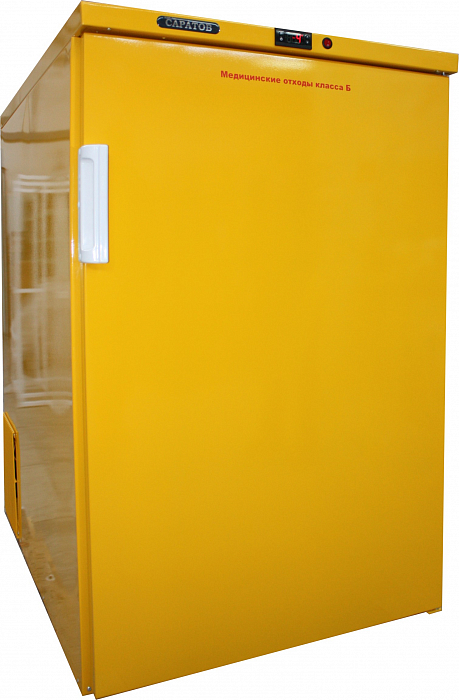 Холодильник выполнен согласно требованиям СанПиН 2.1.7.2790-10. Он окрашен в желтый цвет, может комплектоваться 240 литровым баком на колесах , для медицинских отходов класса «Б», имеется бактерицидная лампа для дезинфекции емкостей и внутренней камеры, установлен электронный контроллер температуры, что позволяет легко регулировать и визуально контролировать температурные показатели.