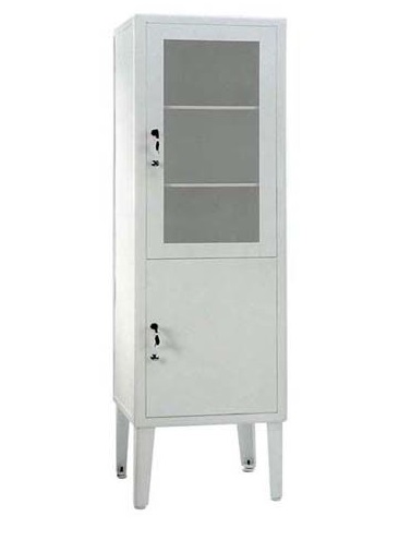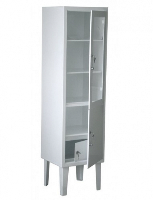 - Шкаф медицинский одностворчатый, цельносварной, двухдверный, двери с мебельными замками, верхние двери с остеклением, нижние - металл, встроенный сейф (трейзер).
