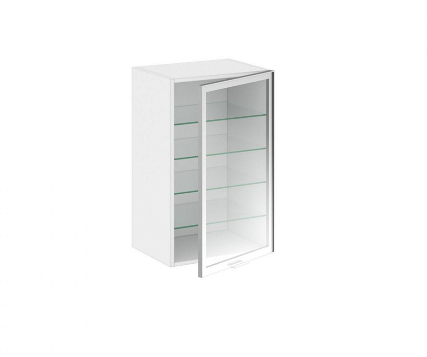 Медицинский шкаф навесной для материалов с одним распашным фасадом из анодированного алюминия со стеклом и с четырьмя стеклянными полками.