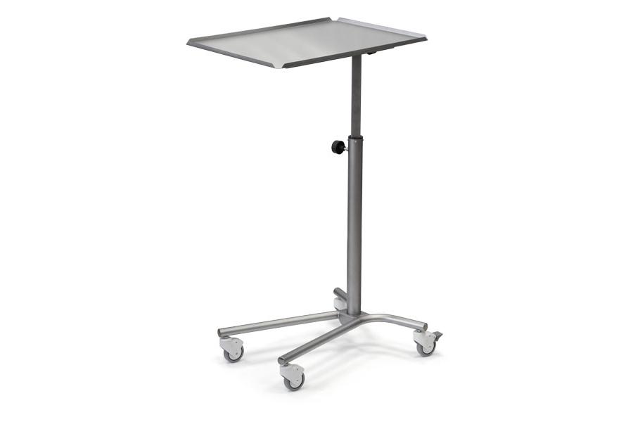 Возможность поворота рабочей поверхности в горизонтальной плоскости позволяет устанавливать столик над панелями операционных столов различных моделей. Это удобно для работы операционной бригады. Регулировка высоты и положения рабочей поверхности столика производится вручную с фиксацией при помощи винтовых зажимов. Основание столика имеет поворотные обрезиненные колесные опоры Ø 80 мм, две из которых с тормозом.