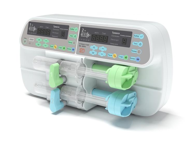 Двухканальный шприцевой насос SN-50F6 объединяет в себе два автономных шприцевых насоса, что позволяет осуществлять введение двух растворов с индивидуальными параметрами инфузии.