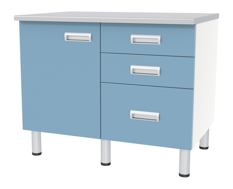 Столик стоматолога металлический, столешница с трехсторонней отбортовкой, 4 ящика, на роликовых направляющих.