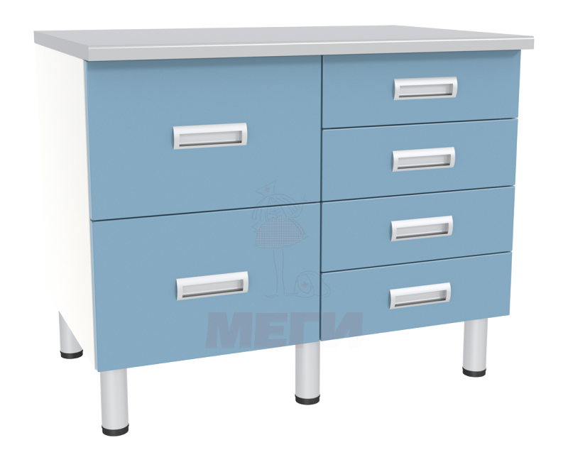 Столик стоматолога металлический, столешница с трехсторонней отбортовкой, 4 ящика, на роликовых направляющих.