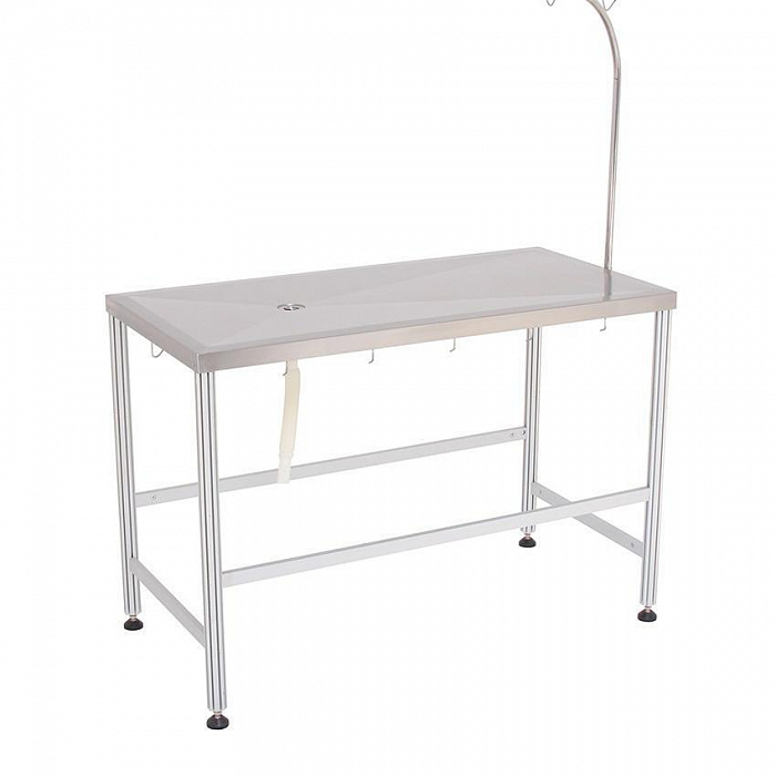 Столешница стола изготовлена из нерж. стали, под нижним краем, по периметру столешницы находятся крючки для фиксации животного.