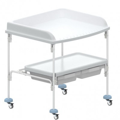 - Каркас стола из металлических труб круглого сечения с химически стойким порошковым покрытием. С целью облегчения санитарной обработки – несварная. На рамной конструкции размещены столешница и нижняя полка с выдвижными ящиками. Нижняя полка с ящиками предназначена для размещения необходимых предметов при проведении осмотра, манипуляций и пеленания детей.