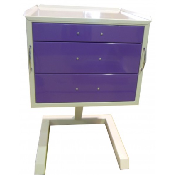 Столик стоматолога металлический, столешница с трехсторонней отбортовкой, 3 ящика, на роликовых направляющих. Корпус с ящиками установлен на одной опоре и П-образном основании.Характеристики: