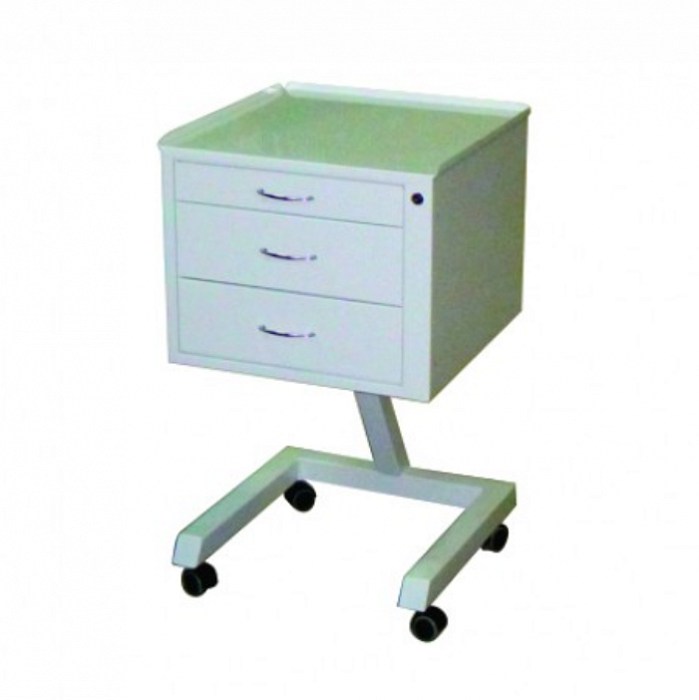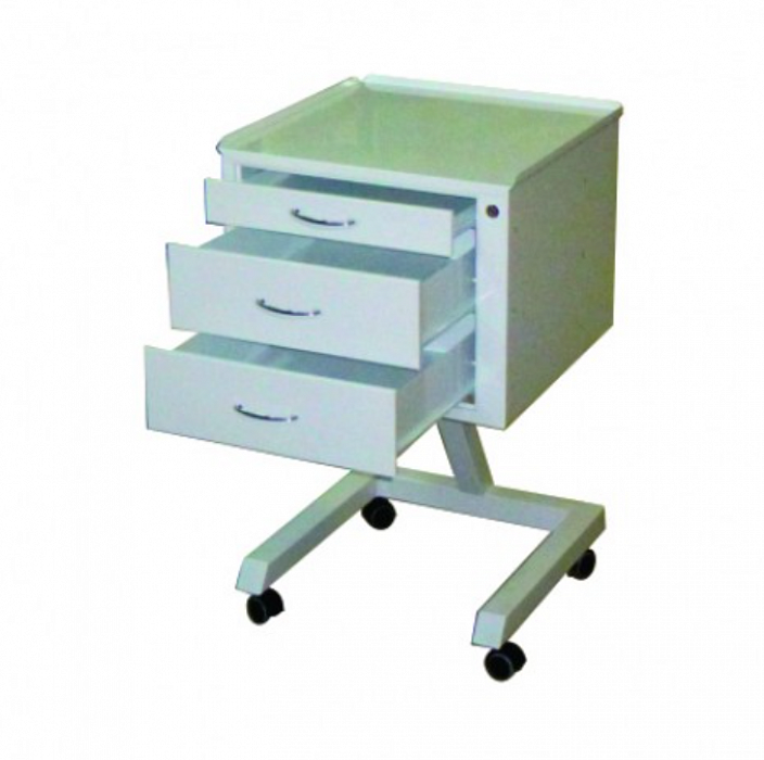 Столик стоматолога металлический, столешница с трехсторонней отбортовкой, 3 ящика, на роликовых направляющих. Корпус с ящиками установлен на одной опоре и П-образном основании.