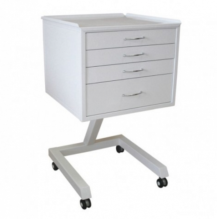 Столик стоматолога металлический, столешница с трехсторонней отбортовкой, 4 ящика, на роликовых направляющих. Корпус с ящиками установлен на одной опоре и П-образном основании.