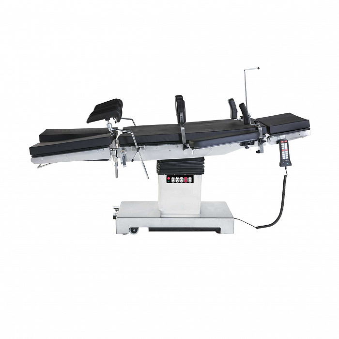 Электромеханический операционный стол имеет 5 ренгенопрозрачных секций, ножная секция – раздельная, съемная. Основание станины выполнено из нержавеющей стали. Под основанием есть колеса для перемещения стола. Блокировка колес осуществляется ножной педалью. Все основные регулировки углов наклона секций выполняются электроприводами с помощью выносного проводного пульта управления (или с беспроводного пульта Bluetooth). Есть дублирующий пульт на колонне стола. Регулировка угла наклона головной и ножных секций выполняются с помощью газовых пружин. Подушки стола противопролежневые, из вязкоупругого поролона, с функцией сохранения формы. Возможность применения рентгеновского аппарата с С-образной дугой. Есть возможность установки рентгеновской кассеты.