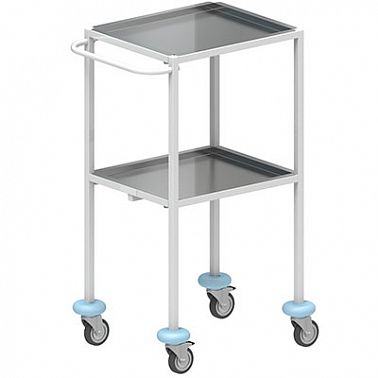 Рамная конструкция из металлических труб квадратного сечения 20х20 мм с химически стойким порошковым покрытием. Поддоны из полированной нержавеющей стали. Рабочая поверхность поддонов 400х330 мм. Глубина поддонов 20 мм. Расстояние между поддонами 400 мм. Грузоподъемность не более 20 кг. Габаритные размеры 580х450х890 мм. Масса не более 15 кг. Тележка имеет поворотные колесные опоры с резиновым ободом из светлой резины, не оставляющей следов на поверхности пола. Два из четырех колес, расположенных по диагонали, имеют тормоз.
