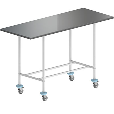 Столешница из полированной нержавеющей стали. Рабочая поверхность столешницы 1470х580 мм. Грузоподъемность не более 50 кг. Габаритные размеры 1470х580х925 мм. Масса не более 22 кг. Рамная конструкция из металлических труб квадратного сечения с химически стойким порошковым покрытием. Тележка имеет поворотные колесные опоры d-75 мм с резиновым ободом из светлой резины, не оставляющей следов на поверхности пола. Два из четырех колес, расположенных по диагонали, имеют тормоз.