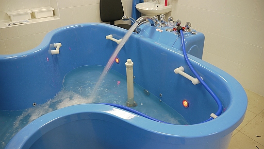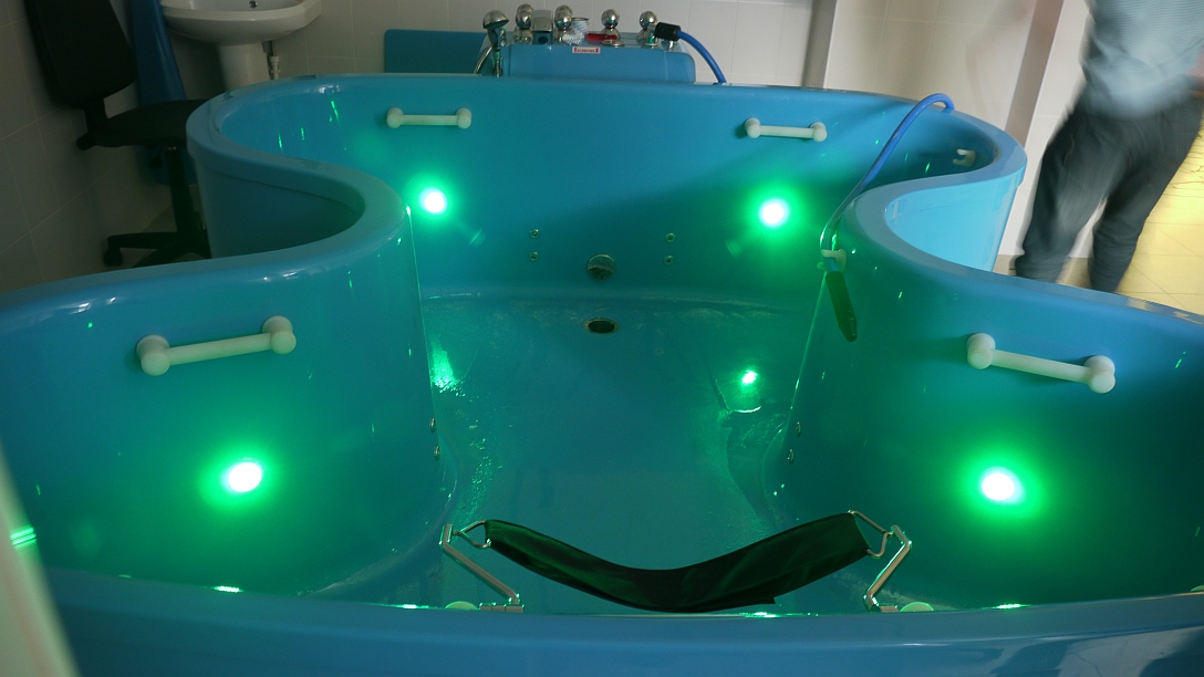 - Ванна для кинезотерапии может быть дополнительно оборудована системой подводного ручного гидромассажа, а также жемчужным массажем и хромотерапией. Встроенные регулятор давления и манометр позволяют точно регулировать силу исходящей из гидромассажного шланга водяной струи в пределах от 1 до 6 бар.