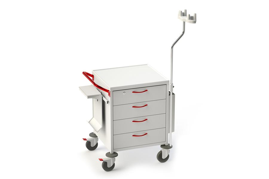 Тележка анестизологическая2 выдвижных ящика полного выдвижения на телескопических направляющих с центральным замком и съемными перегородками для удобного зонирования рабочего пространства Нижнее отделение с двумя распашными дверцами, с комфортным углом открытия дверок 110° выдвижной столик из ABS-пластика, увеличивающий рабочую поверхность .